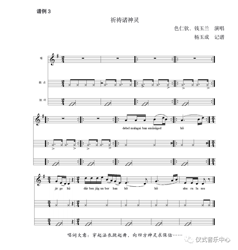 请神阶段包括设坛、亮鼓、入场、祈祷、迎神等几个部分。(乌兰杰 1998:219—221)每个仪式阶段都有与之相应的神歌和舞蹈。例如,前面谱例3《祈祷诸神灵》便是一首请神仪式开始时演唱的颂神神歌。再看一例: