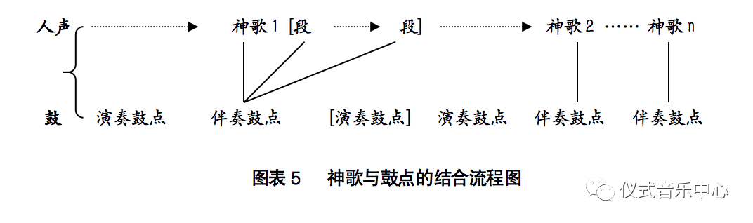 “演奏鼓点”与神歌的“前奏、间奏、尾奏”等位置是相对应的,而“伴奏鼓点”与神歌的演唱部分相对应。这里,随着神歌与演奏鼓点交替出现,神歌与伴奏鼓点形成同步。