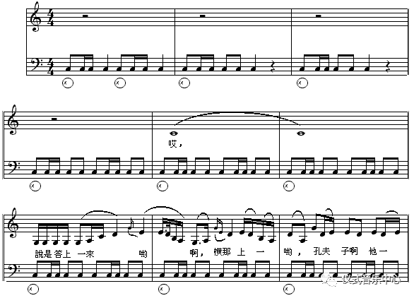 【乐谱下端的圆圈加点是用鼓槌敲击鼓的边缘部分】