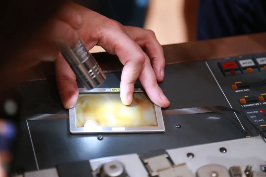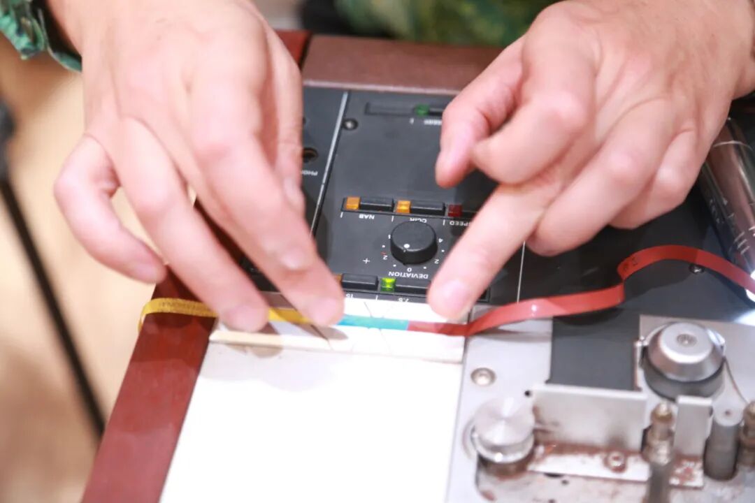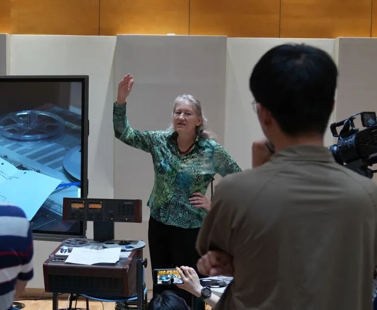 随后,部分学员在娜迪亚的指导下,实际操作了校准过程。本单元最后,娜迪亚对一盘因保存不当,磁带部分和底部托盘部分已经分离,即脱盘的开盘带进行了处置演示。这一部分充分体现了几天来她所讲授与演示的开盘带相关知识与操作要求,让学员们对理论知识与实践操作的关系有了融会贯通的认识。如她指出即使盘面没有记载,但这盘录制了1980年代上音学生流行歌曲比赛的磁带并非原始母带,而是复制带。因为母带与复制带在实际操作中改变磁头角度时的波形显示完全不同,而她即使改变磁头位置也没有出现母带应该有的波形变化。此外脱盘带如何以慢速卷放以便能顺利播放出,和在慢卷过程中发现的磁带粘化等前几日讲述过的知识,都让实际参与操作的学员加深了认识。