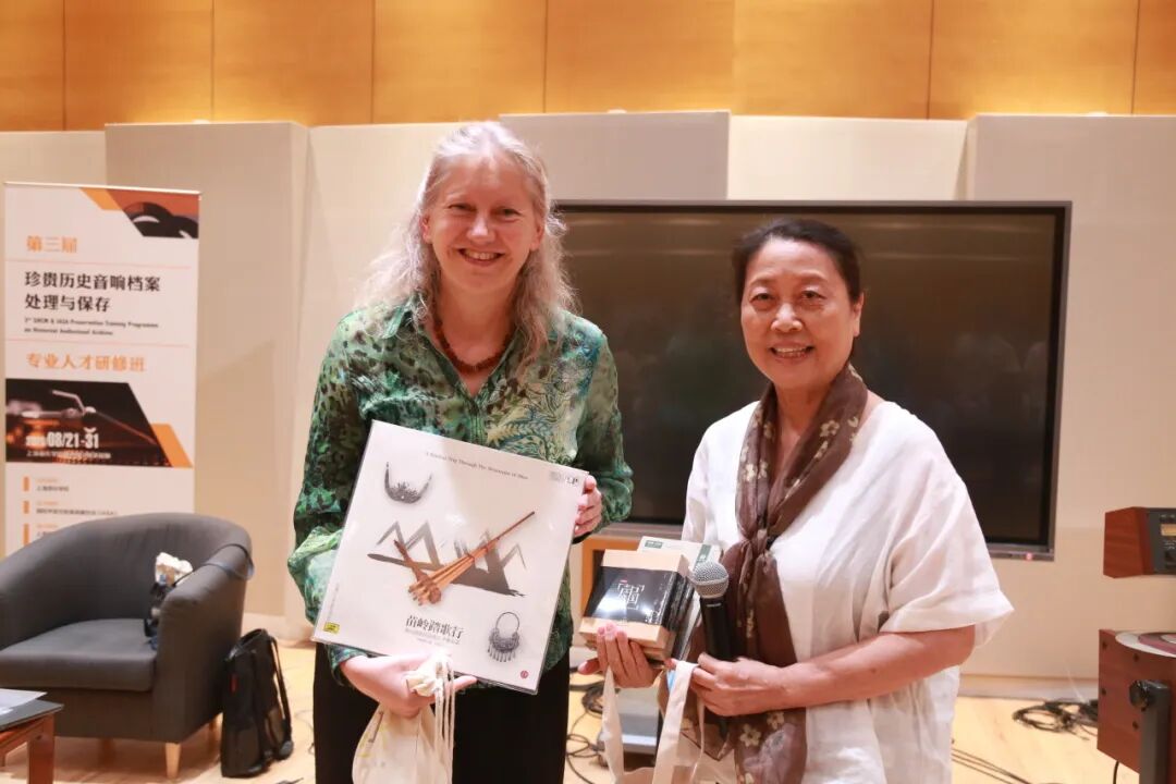 本日的最后是录音载体部分的小结,也是娜迪亚在6天密集而高效的理论与实践教学过后,要和研修班学员们告别的日子。萧梅老师代表学院与研修班全体向娜迪亚及几位专家赠送了音响/像档案制品,并对她们的认真、敬业、无私的传授与分享表达了感谢。最后以一张全体学员与教师的合影结束了本次研修的第一阶段教学活动。