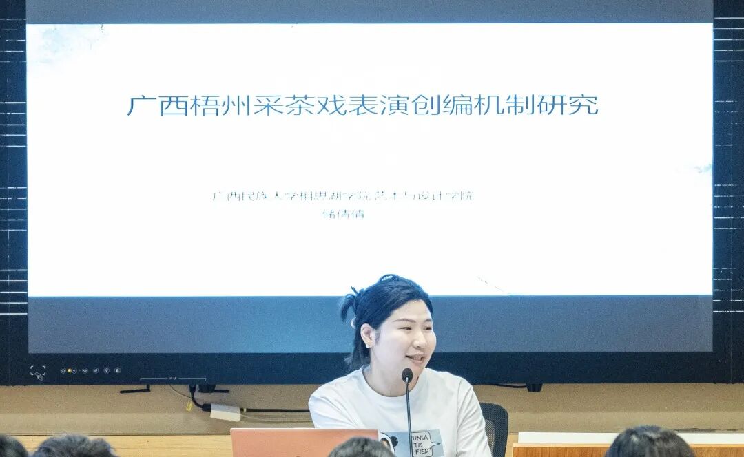 第二位发言人是广西民族大学相思湖学院艺术与设计学院老师储倩倩,发言题目是《以声传情,以身传意——梧州采茶戏表演创编研究》。她从梧州采茶戏的基本情况出发,具体分析了剧本创编、唱词、念白、音乐使用等方面,总结出采茶戏表演创编的内在机制——剧情、唱念、动作均有可变的部分,但故事主框架、主干情节、程式化的唱词以及特定场景的唱段通常是不可改变的。她以系列式、叙述式梳理口头剧本的不同建构方式,以及角色用调、情景用调等编创方法。