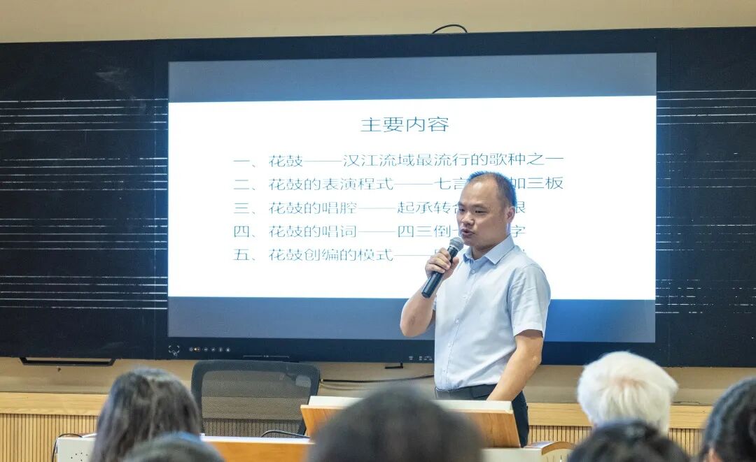 第一位发言人是湖北文理学院音乐与舞蹈学院副教授凌崎,发言题目是《套语·结构——汉江流域花鼓类民歌的创编模式》。在简要介绍汉江流域“花鼓类民歌”后,他结合各种音频和谱例,从表演程式(七言四句加三板)、唱腔(起承转合三板眼)、唱词(四三倒七加衬字)三个方面展开分析,总结出花鼓的创编模式是在规则中进行的一种即兴表演。最后,他与场下互动,刘雯老师念起“李白乘舟将欲行”这首七言绝句,凌崎立即用江汉花鼓民歌创编模式将诗句演唱了出来,生动展示出在“套语-结构”中,“小小花鼓乱求说”如何体现出民间的编创能力。