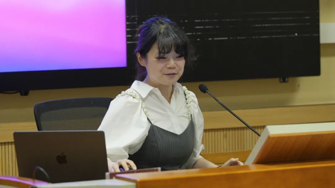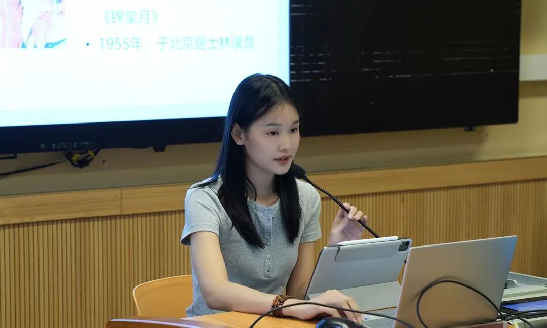 第四位发言人是上海音乐学院2022级硕士研究生梁梓淇,发言题目是《从1955年<锦堂月>历史录音看京音乐月调的实践方式》。她从一份历史录音出发,先为我们简单介绍和播放了这段录音。在对比理论上的月调调高和聆听得出的实际调高并发现二者的差异后,她展开对谱本、唱名法、指法等的进一步探究,得出这种情况是在“抄谱-认谱-奏谱”过程中,工尺谱首调与固定唱名法的交织以及特定的月调指法共同作用的产物,指出理论研究和实际演奏中京音乐月调的差异及其背后的原因。
