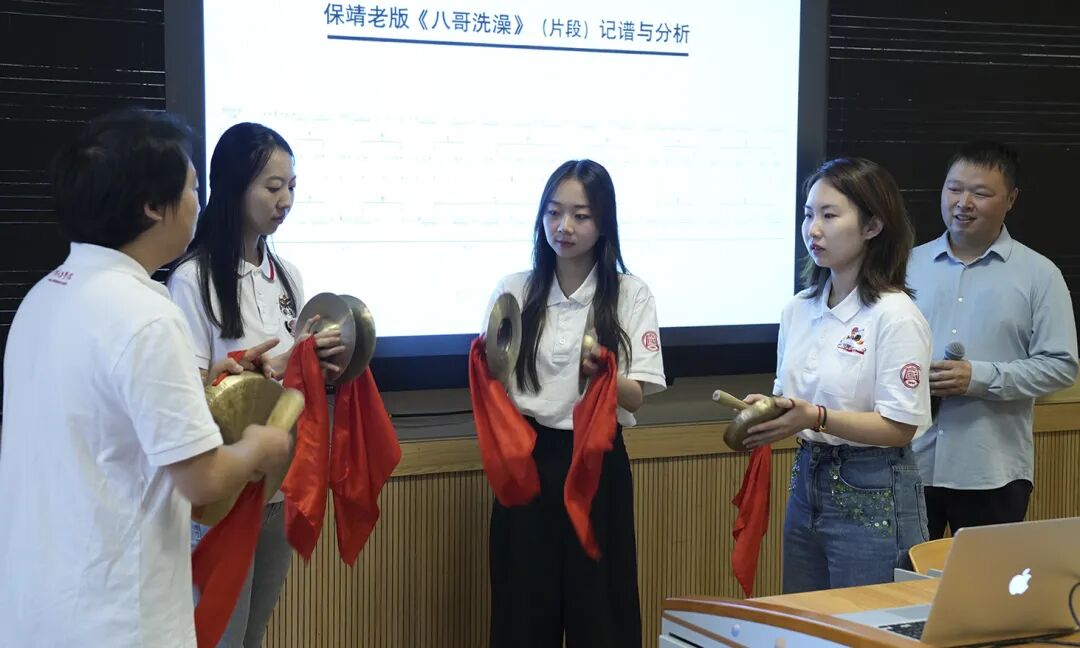 第一位发言人是中国音乐学院音乐学系副教授王先艳,发言题目是《土家族打溜子的声部组合特征及不同体裁的互文分析》。他先对打溜子及其以声部为标准的乐种特征进行概述,结合具体实例讲解了声部特征,总结出打溜子是充分运用简单元素进行的变化组合,而这种丰富且有逻辑的音乐思维在土家族的其他音乐体裁里也同样存在。最后,王先艳老师的学生在现场演奏了打溜子作品《八哥洗澡》(头钹:文静;二钹:岳喆;马锣:楚晴;大锣:向晓春),充分演示了打溜子乐器各声部之间紧密交织变化的特点。