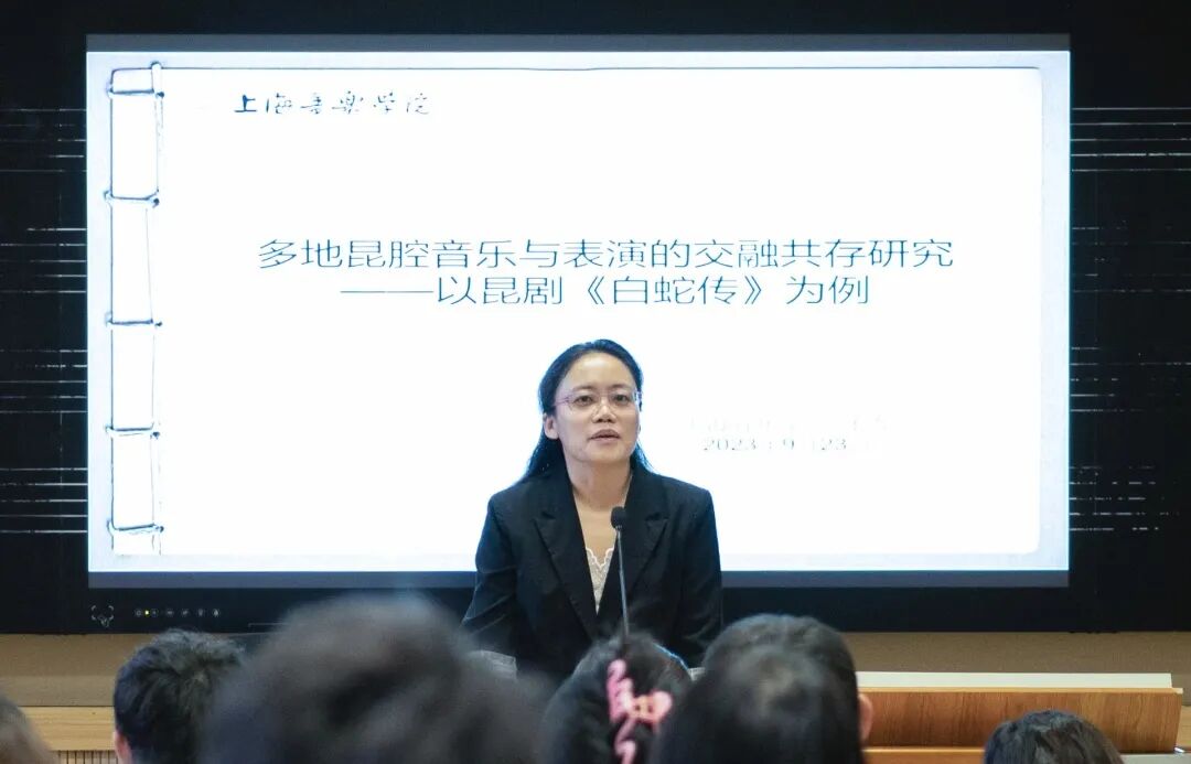 第四位发言人是上海音乐学院音乐学系副教授张玄,发言题目是《多地昆腔音乐与表演的交融共存研究——以昆剧<白蛇传>为例》。她从昆剧《白蛇传》的基本情况出发,从表演技巧、用嗓的变化、润腔吐字及曲牌阐释等角度,分析当代昆曲各支脉之间的相互借鉴、融合现象,总结出不同的剧种可能有不同的唱腔音乐,但在表演上却向成熟剧种直接借鉴,运用相近或相同的程式。