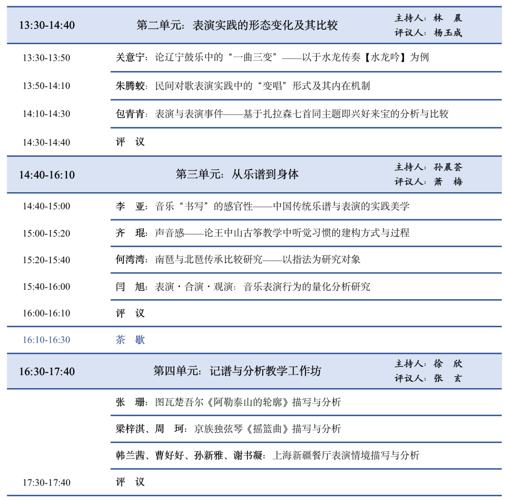 为更好地应对当下学术问题与学科建设的挑战,上海音乐学院音乐学系、中国仪式音乐研究中心、音乐艺术研究院将共同举办“多元文化中的音乐形态与表演分析研讨会”。本次会议包括一场主旨发言、五场主题研讨、一场教学工作坊、一场读书会以及圆桌讨论,共邀请全国各地以及来自本院的专家学者、研究生36人参会,会议日程如下: