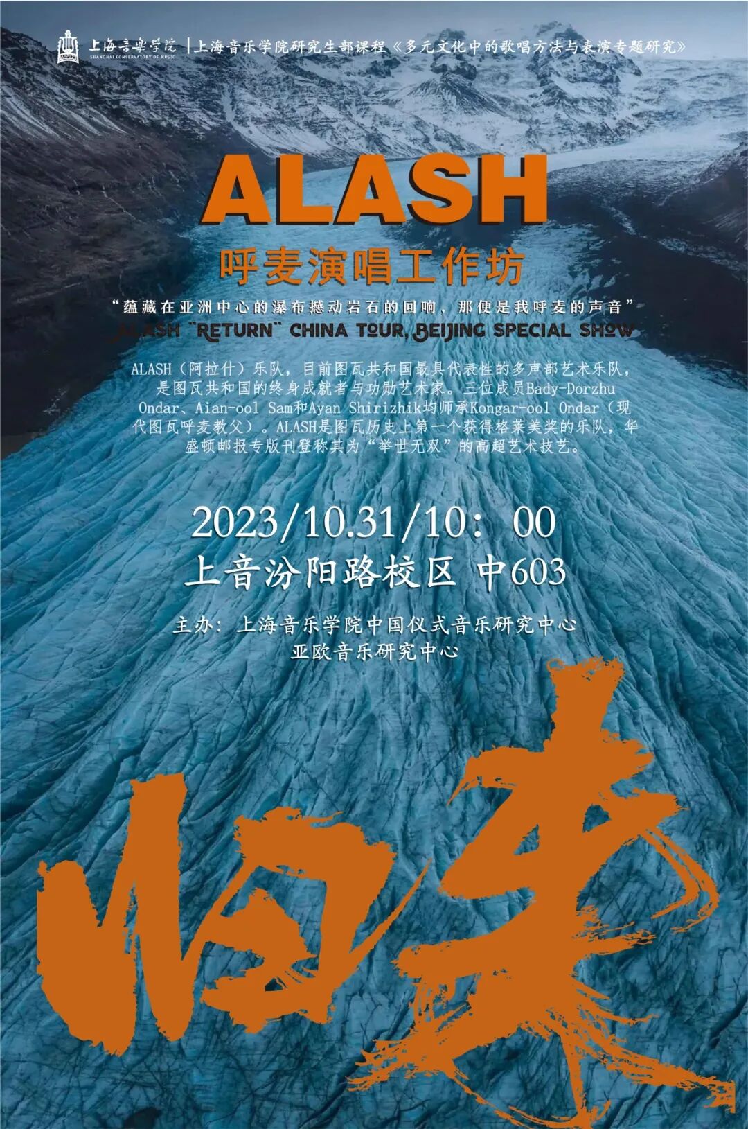 本次工作坊的主要内容包括乐队形成与发展的基本介绍,图瓦呼麦的不同类型和演唱方法,图瓦传统乐器的演奏技巧、图瓦传统曲目中的自然与情感等。ALASH乐队的三位老师还将与师生们一起互动,教授呼麦演唱技巧。