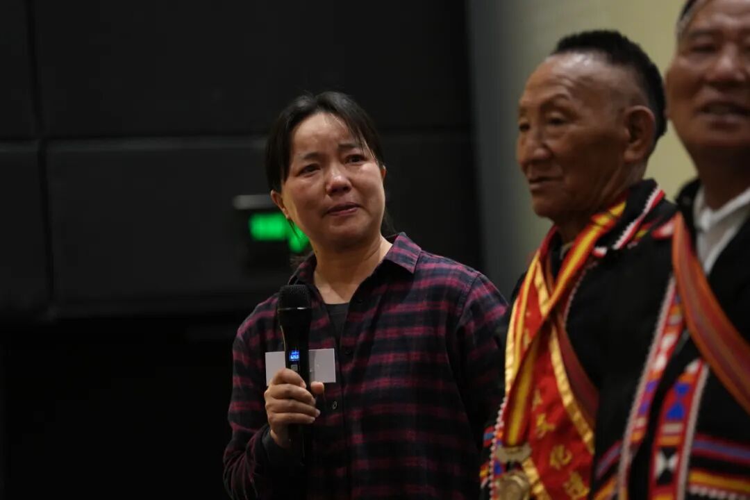 上午第二场由策展人程俏俏主持。影片的导演徐菡,学术专员李建波,还有影像中的文化主体——四位牡帕密帕传承人来到现场。