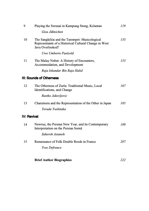 复合簧管乐器的研究在民族音乐学及相关领域一直鲜有人涉猎,但其值得被关注。为了填补当前学术研究的空白,上海音乐学院于2018年举办了第25届国际传统音乐舞蹈学会专题研讨会《丝绸之路上的复合簧管乐器:理论与实践的互动,从古代到当代表演》。本书收录了该研讨会中的多篇论文,对已有的历史及民族志的文献展开分析,提供了一些曾经被忽视领域的信息。
