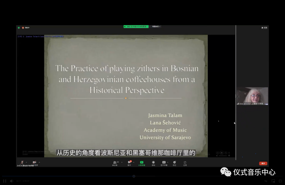 第二位发言人是波黑萨拉热窝音乐学院的贾斯米娜·塔兰和拉娜·什霍维奇两位教授,她们带来的发言题目是《从历史的角度看波斯尼亚和黑塞哥维那咖啡厅里的铙钹和卡龙琴(qanun)的演奏》。首先,加斯米娜教授对波黑历史中有关齐特类乐器的音乐传统与实践进行简要介绍,她指出,齐特琴在奥斯曼帝国统治时期只由外国人演奏。虽然民间音乐实践中没有齐特琴的使用记录,但是我们可以通过新形成的西欧类型的音乐基础设施的棱镜来观察齐特琴的使用。