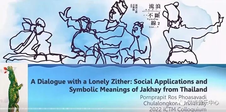 波恩普拉蒂特教授的演讲围绕一件来自泰国中部的齐特琴乍凯(Jakhay)展开,共分为五个部分。她首先介绍了乍凯的背景,包括乐器的形制与泰国乍凯演奏家的社会意义。乍凯是一种三弦琴。它由菠萝蜜树制成,有固定的十一个品,其形状像一只短吻鳄。演奏者在按弦的同时,需要用绑在右手食指上的拨片在每根弦上拨动或敲击。演奏者的坐姿也是每个琴手所属的风格和流派的标志。