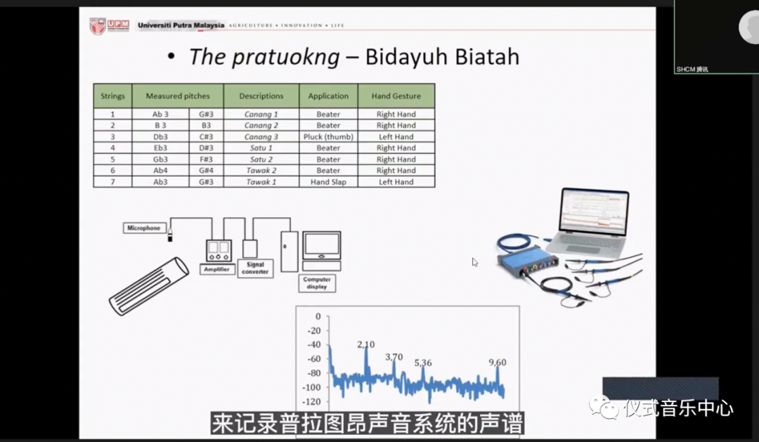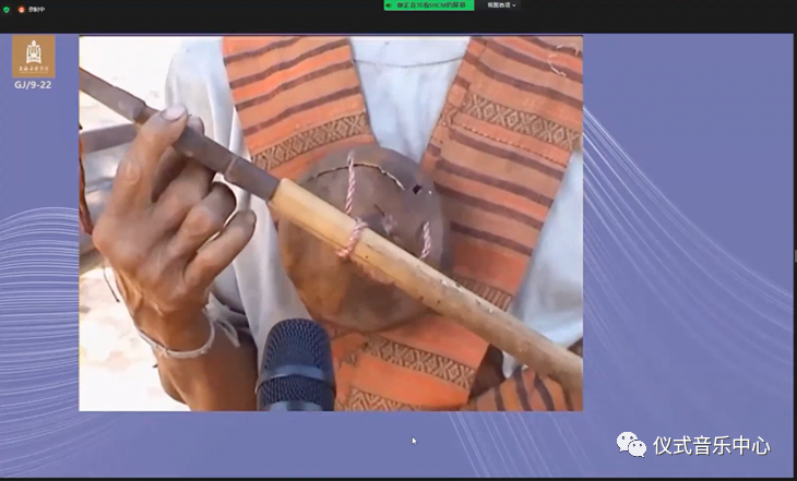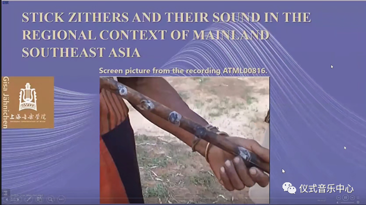 下一位演讲者是来自上海音乐学院的吉萨教授。她在演讲开始之前,首先播放了两位老挝音乐家的演奏录音,由此引出她的研究对象——兰雅泰村的奥依(Oi)人演奏的双弦棒形齐特kani, 即champitau。吉萨教授表示,champitau这件乐器有一个开放的共鸣体,演奏时必须将之压在胸前,用全身的力量使其发声。约20到40年前,演奏者们在演奏时是不穿上衣的。因为判断这件乐器所发出的声音是否好听,主要还是取决于演奏者上半身裸露的部分。Champitau由双手演奏,右手的无名指和小指敲击琴弦。一根弦演奏低音,另一根弦演奏旋律。