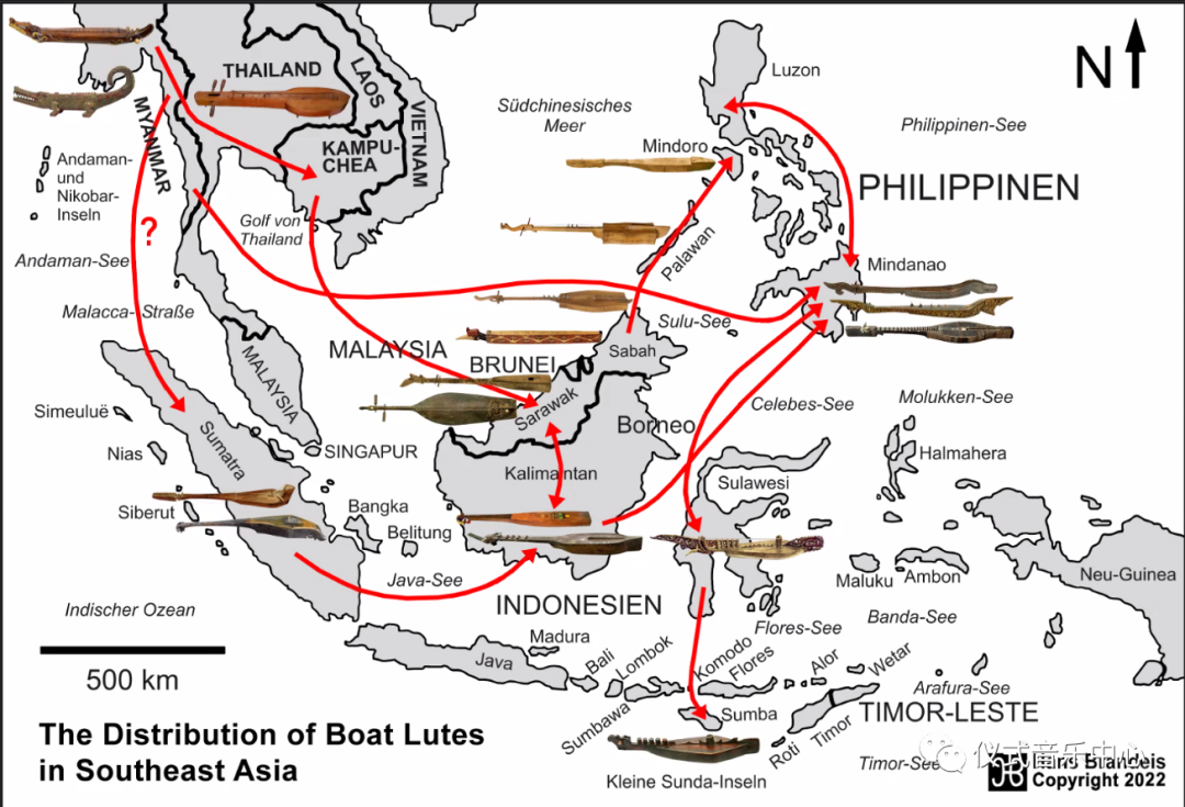 随后,汉斯展示了东南亚地区船型鲁特琴的分布与传播路径。