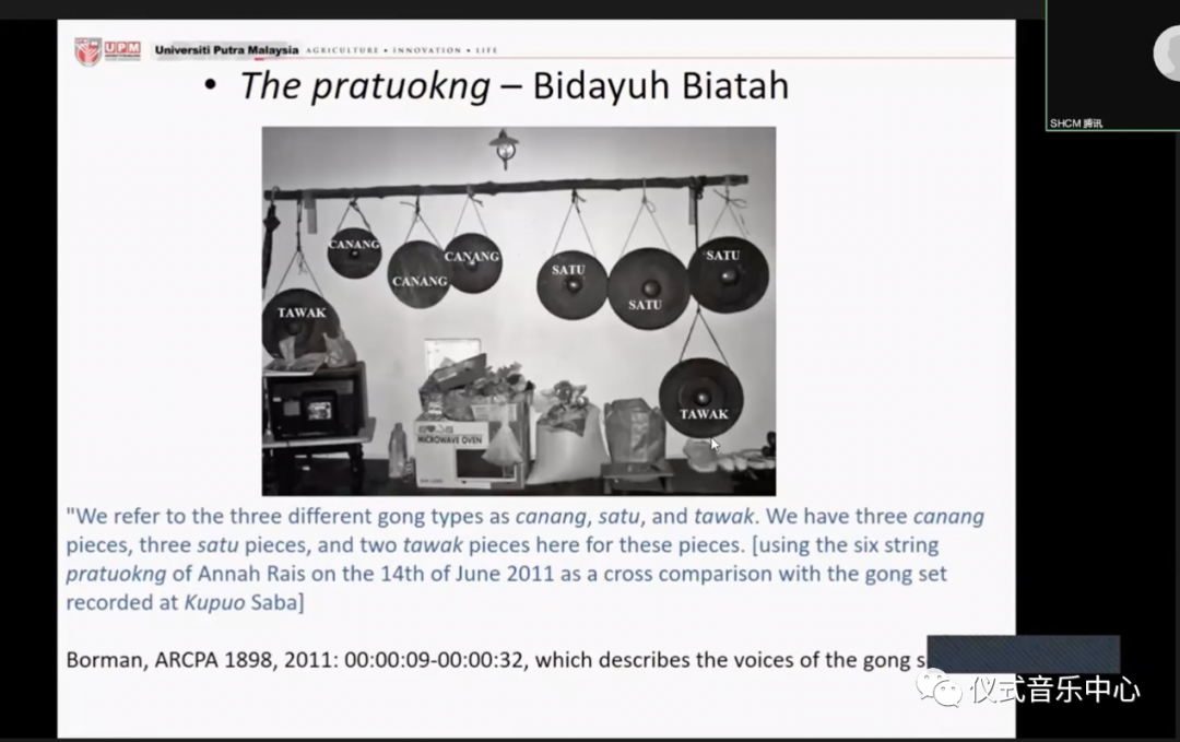 艾哈迈德强调,在研究一件乐器再现声音的能力时,必须考虑每种声音在乐器体系中的功能。比达尤的锣乐合奏由“塔瓦克”(tawak)、“萨图”(satu)和“卡南”(canang)组成,并再现了砂拉越州佩达湾(Pedawan)安纳莱斯(Annah Rais)普拉图昂的发声装置系统(声辐射器,sound radiator)。