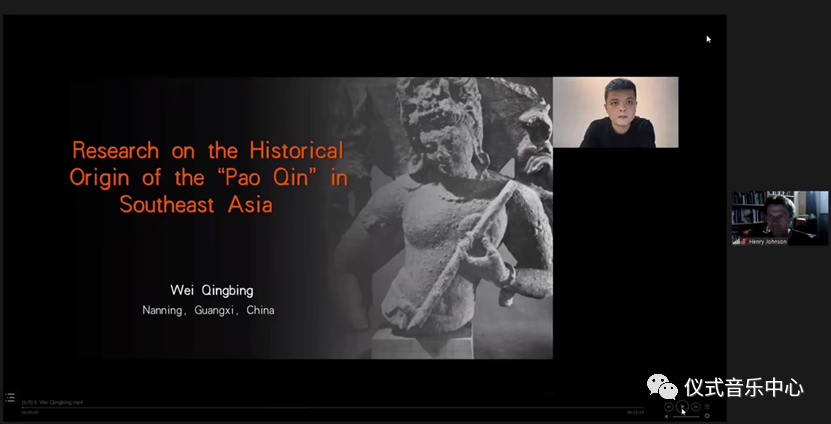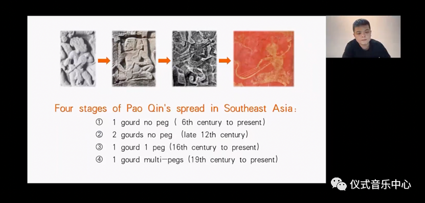 接下来,来自中国的独立学者韦庆炳以《东南亚匏琴历史源流初探》为题展开演讲。他以印度和东南亚历史遗迹中的匏琴图像及现存的匏琴实物作为研究对象,运用民族音乐学、音乐图像学等理论方法,重点考察东南亚匏琴发展的历史脉络和当下的生存状况,梳理与考证匏琴在不同国家、不同历史时期的形制特点,推测其传播路线。韦庆炳首先介绍了匏琴在东南亚不同国家的称谓,指出匏琴从印度传到东南亚,是一个文化传播的过程。他借助文化传播的“三个阶段”理论将匏琴的传播路径归纳为“接触与显现”“选择”“采纳与融合”。接着,他梳理了印度和东南亚国家历史遗迹中发现的匏琴图像,详细分析了匏琴图像的年代、分布区域、形制特点,进而提出匏琴在东南亚传播的四个阶段:单匏无轸(6—至今)、双匏无轸(12世纪末)、单匏单轸(16世纪至今)、单匏多轸(19世纪至今)。