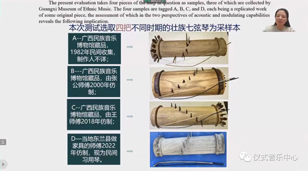 第三位发言者广西艺术学院楚卓教授讨论了壮族七弦琴音乐性能与生态评测,壮族七弦琴是擦奏类弦鸣乐器,源于中国最早的弓弦乐器轧筝,流行于中国广西东兰、凤山、巴马等县,壮语称“趁垠”(Chen yin),意为七弦。楚卓教授经过测试选取四把不同时期的壮族七弦琴为采样本,分别进行了音高、音准、音域、音量、音长的指向性检测、音色以及结构与材料特性的比较。