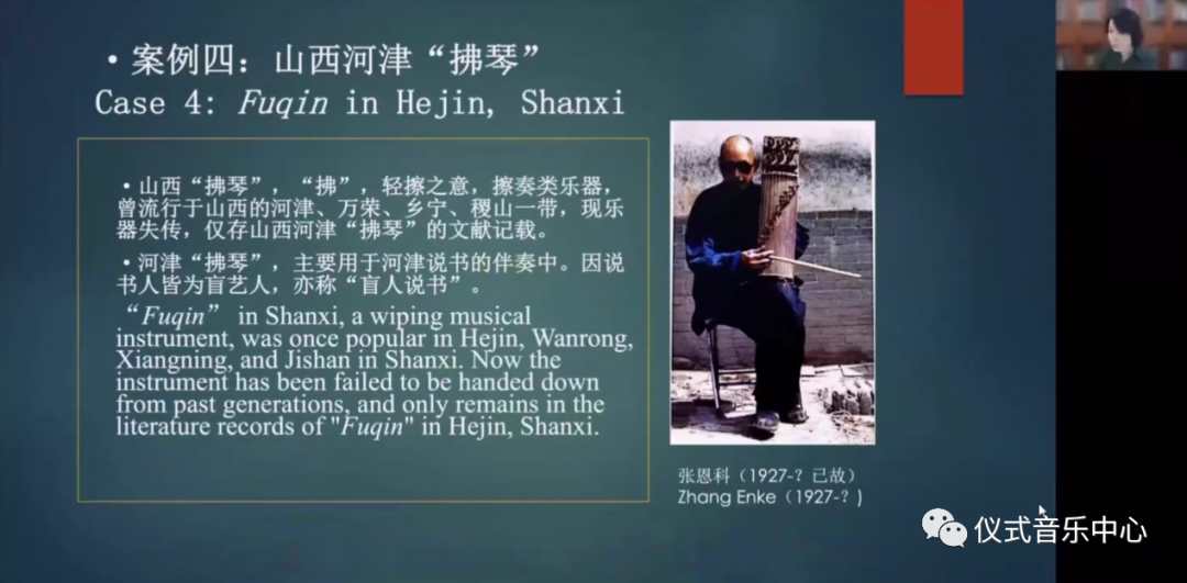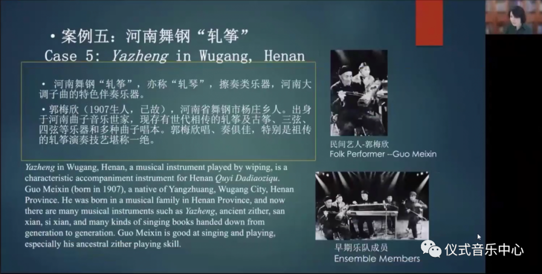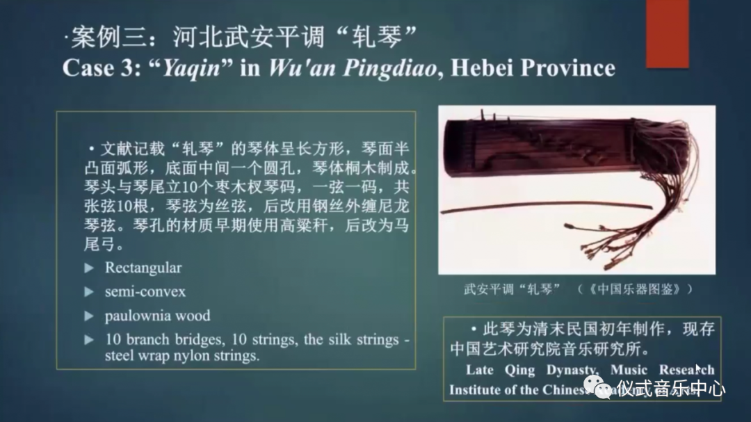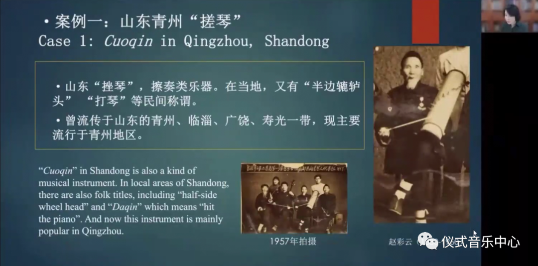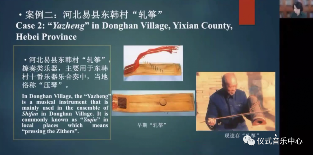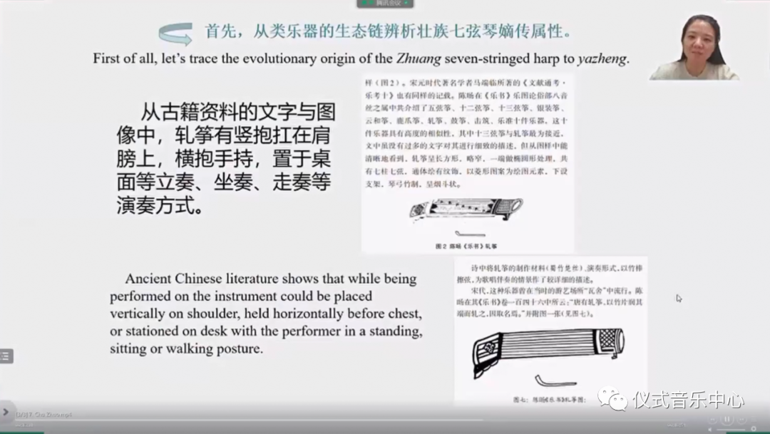 第二位发言者是河北师范大学崔晓娜教授,她宣讲的内容为中国北方地区“轧筝”类乐器的模式研究。她选取北方地域五个案例:山东青州“搓琴”、河北易县东韩村“轧筝”、河北武安平调“轧筝”、山西河津“拂琴”和河南舞钢“轧筝”,通过对以上五个案例“轧筝”类乐器及具体用乐情况,运用乐种学“模式分析法”,结合历史文献“轧筝”的样态,辨析其不同类型的结构与音乐形态特征。
