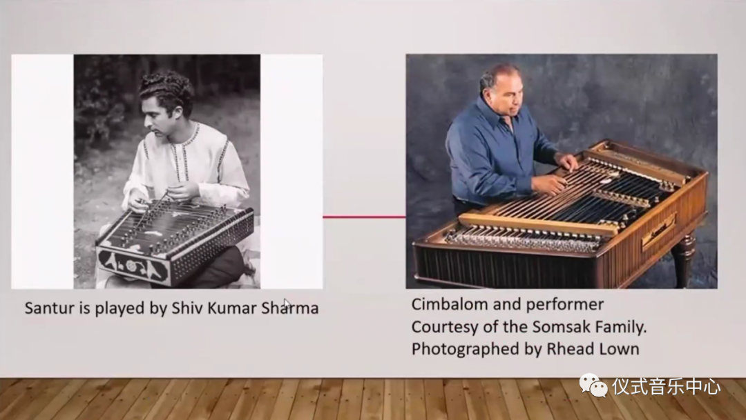 其次,他介绍了北印度音乐领域广泛使用的齐特琴——桑图尔,它似乎起源于波斯,这种乐器从波斯传播到许多其他地区,最明显的例子是来自中国的扬琴和匈牙利的钦巴龙。桑图尔在北印度和巴基斯坦的苏菲派音乐中使用过。