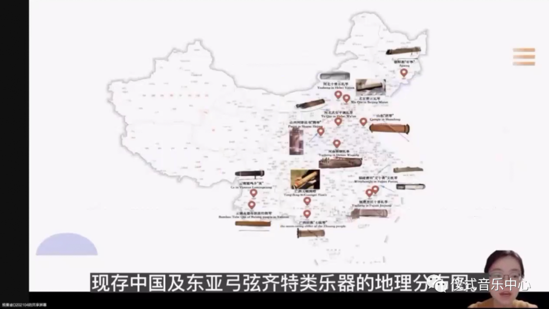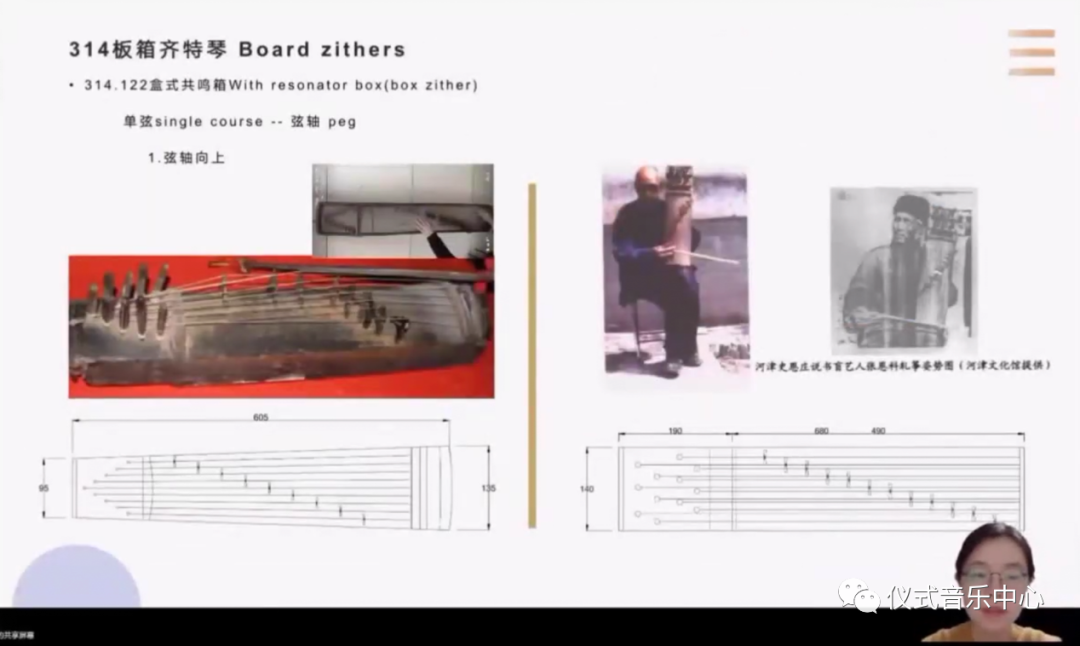 第一位发言者是上海音乐学院博士研究生熊曼谕,她根据田野考察及前人研究总结出一张现存中国及东亚弓弦齐特类乐器的地理分布图,从图中可以看出,轧筝类乐器分布于中国9个省份,13个地区,涉及13个乐种。从形制上,根据H-S乐器分类体系,轧筝类乐器属于31单一弦鸣乐器或齐特琴,中国及东亚的弓弦齐特类乐器可以分为两大类,即管式齐特琴和板箱型齐特琴,在板箱型齐特琴中,她根据琴弦结构分为单弦与双弦两大类,复弦类主要集中于河北及山东等北方地区,存见于河北十番乐、北京密云五音大鼓等乐种中。单弦类则主要集中于河南、福建、广西、云南等南方地区,存见于莆田文十音、晋江十番等乐种中。