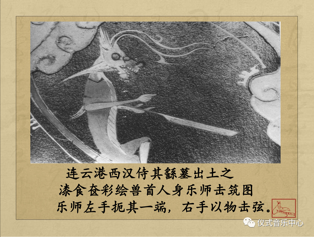 第二部分“古琴前身是先秦击筑”,牛陇菲指出古琴的前身是先秦时期的击筑,中国乐师在先秦击筑上,进行了击弦取音的实验。随后,他举例了曾侯乙墓出土的筑、长沙西汉马王堆墓出土的筑和汉墓彩绘棺的击筑图、以及连云港的西汉彩绘兽首人身乐师击筑图等,认为击筑以竹尺遍击琴弦不同节点无极变音的“一弦多音”之举,是后世古琴、三弦、小提琴等无品弦乐器自由按弦取音技术的滥觞。