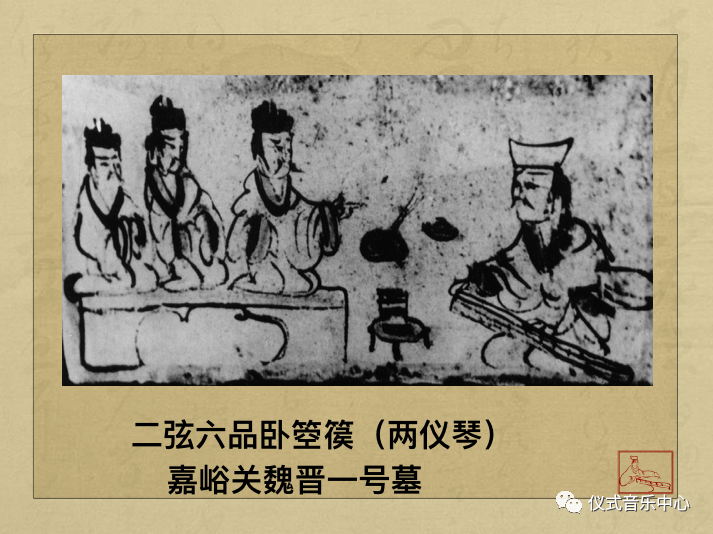 第三部分“汉魏古琴是有通品之卧箜篌”,牛陇菲对比了嘉峪关魏晋三号墓和一号墓室砖画上的齐特类乐器,并认为其是有通品装置的卧箜篌,而非《嘉峪关魏晋墓发掘报告》所认为的“琴”。卧箜篌于汉魏时期传播到朝鲜,称之为“玄琴”,即今朝鲜伽倻琴之祖。数弦共用的通品,直观显现了定弦不同之各条琴弦,依品取音时琴弦划分的同构规律。受此启发,晋隋之际的中国乐师,“损益乐器”。即损数弦共用通品,益诸弦通用玉徽,成就了如今这样的古琴。