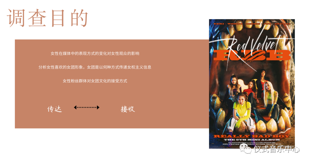我的学期课题拟定为“K-pop女团女性主义转变对国内粉丝群体影响”,调查对象为K—pop女团粉丝群体,以上海音乐学院jumpfairy中的女团翻跳团体为主,以及周边的粉丝群体。