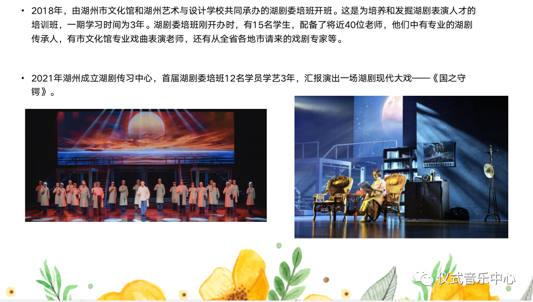 我拟定的题目是湖州市湖剧非遗传承教学基地,湖剧最初起源于田间地头的路头戏,上世纪50年代正式确立了湖剧一名。20世纪80年代后,湖州、嘉兴、德清等地湖剧专业剧团相继撤消,湖剧开始逐渐被城市居民所淡忘,2001年,按照中央、省关于国有文艺院团体制改革的要求,湖州对当时的湖剧团、越剧团等多个国有文艺专业院团进行了改革,专业剧团随之撤销,人员按照政策进行了分流。