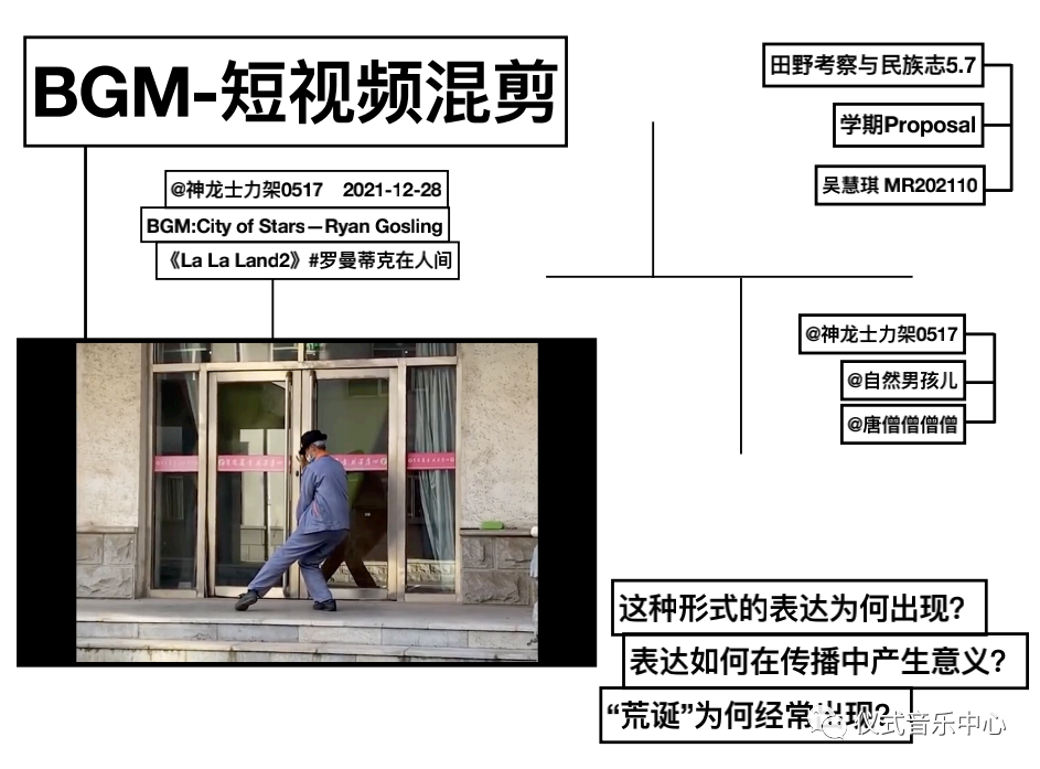 我本学期拟定的课题是“bgm与短视频混剪”。我想要关注的这种剪辑形式,是通过一首歌曲的经验含义、歌词内容、节奏鼓点、音响动态结合单个或多个短视频素材的视觉动态、经验表达进行编配混剪。不同的视频作者剪辑风格上也呈现巨大的不同,并在不断的制作中呈现出一些固定程式、个人风格,与其关心的话题有着密切关系。我关注的视频制作者有三位,分别是@神龙士力架0517 、@自然男孩儿和@唐僧僧僧僧。