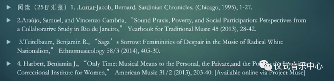 第一篇文献为Bernard Lortat Jacob的专著《撒丁岛编年史》,汇报人为2021级音乐人类学方向硕士生年欣雅同学以及2021级中国传统音乐理论方向博士生刘婷婷同学。