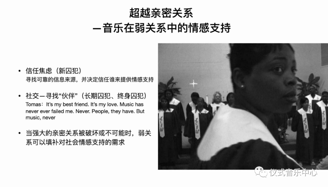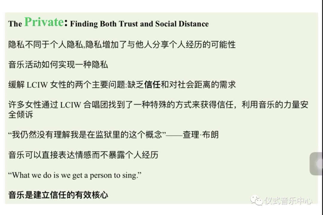 二、隐私层面的特点。作者强调,这种隐私是指一种与他人分享个人经历的可能。通过唱诗班,女性囚犯之间找到了一种特殊的方式来获得信任。音乐是她们建立信任的一个有效核心。