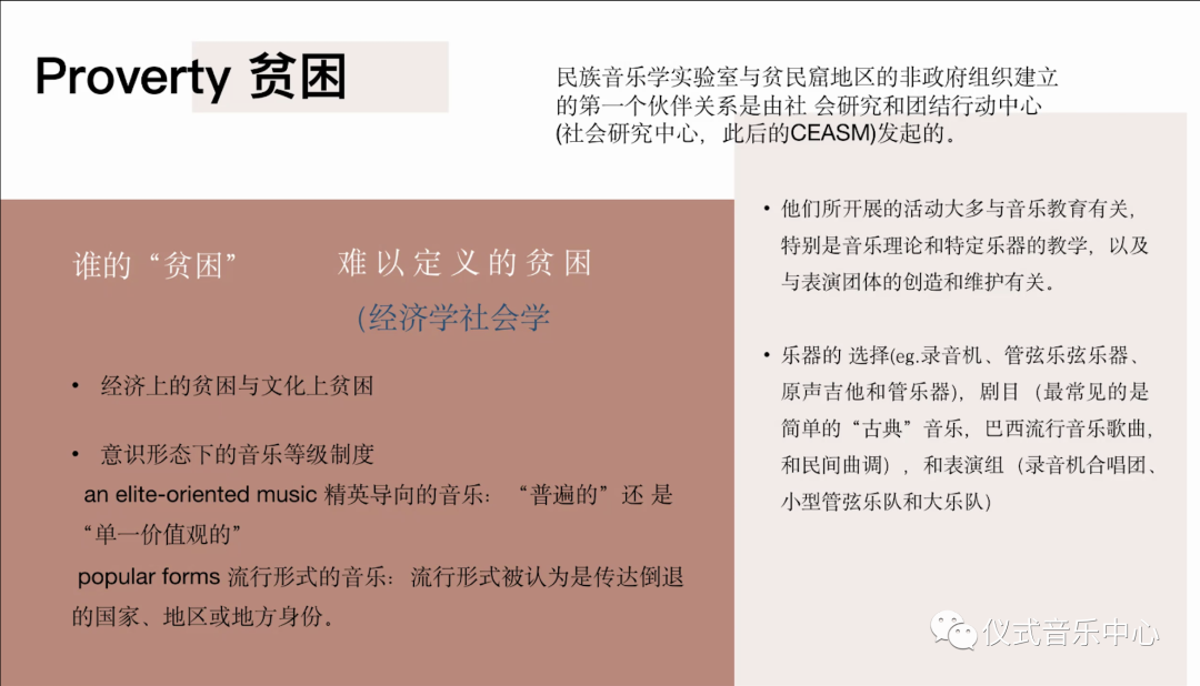 就“贫困”这一大概念而言,贫困和不平等是一种多维现象,它不仅是经济学的问题,也是社会学等各层面上的问题,甚至引发文化与音乐上的贫困这一刻板印象,一种音乐等级制度——所谓精英导向的音乐(anelite-oriented music)被推崇,而流行形式(popular form)的音乐则被认为是传达倒退的国家、地区或地方身份的不好的音乐。如funk音乐、桑巴舞蹈,都被认为是野蛮与暴力的象征,不被推崇的,代表了一种糟糕的品味,不值得研究,更不用说保存。