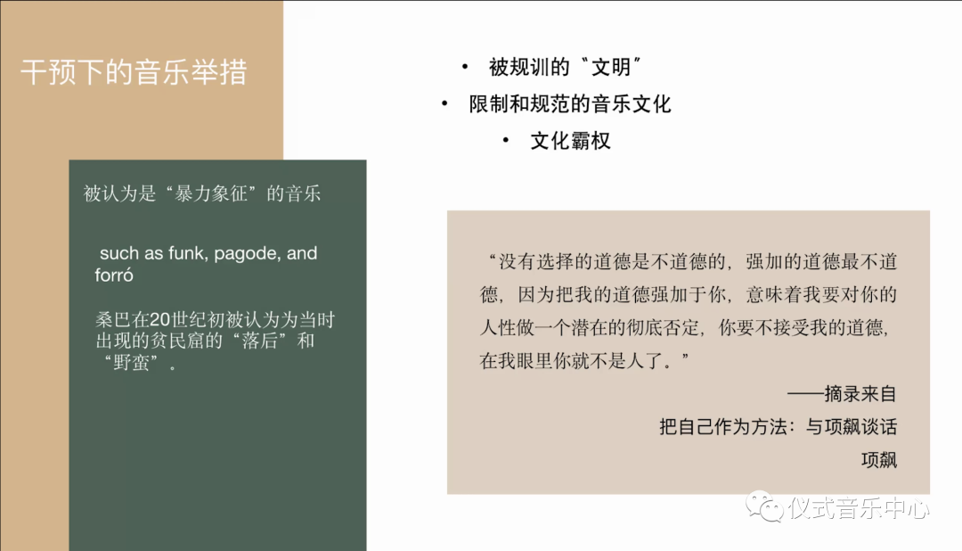 作者在文中对这一现象以及观点表示否定。这种消极的态度可以被解读为反映出皮埃尔·布迪厄和瓦昂特所定义的“象征性暴力”(symbolic violence)。这一概念用来定义主导意识形态和话语通过否定和压迫被主导的“他者”的现实的构建和归化所施加的权力。在这种意识形态干预下的音乐政策,被规训的“文明”,以及被限制和规范的音乐文化充斥着文化霸权。