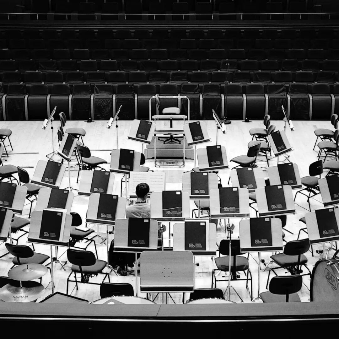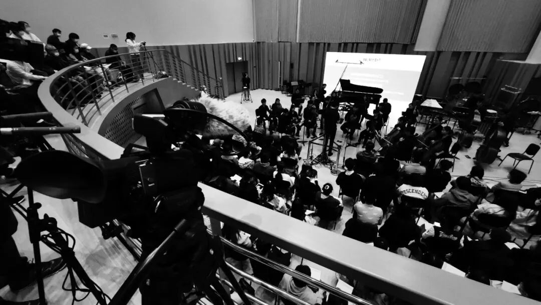 2022年11月16日下午,在老师的带领下,这次《田野音乐影像数据采集与写作》课程中的田野实践课在上音歌剧院·管弦排演厅进行。我们参与的活动是2022首届上海当代音乐节的其中一场:当代室内乐作品音乐会(二)——上音青年作曲家作品。我们分为三个小组进行不同技术实践:录音、摄像、摄影。到达现场时,演出人员还在进行下午演出前的彩排。排演厅分为上下两层,老师带着我们对现场有了初步空间概念判断之后,上到了排演厅观众区域视野和位置都较为开阔明亮的二楼。
