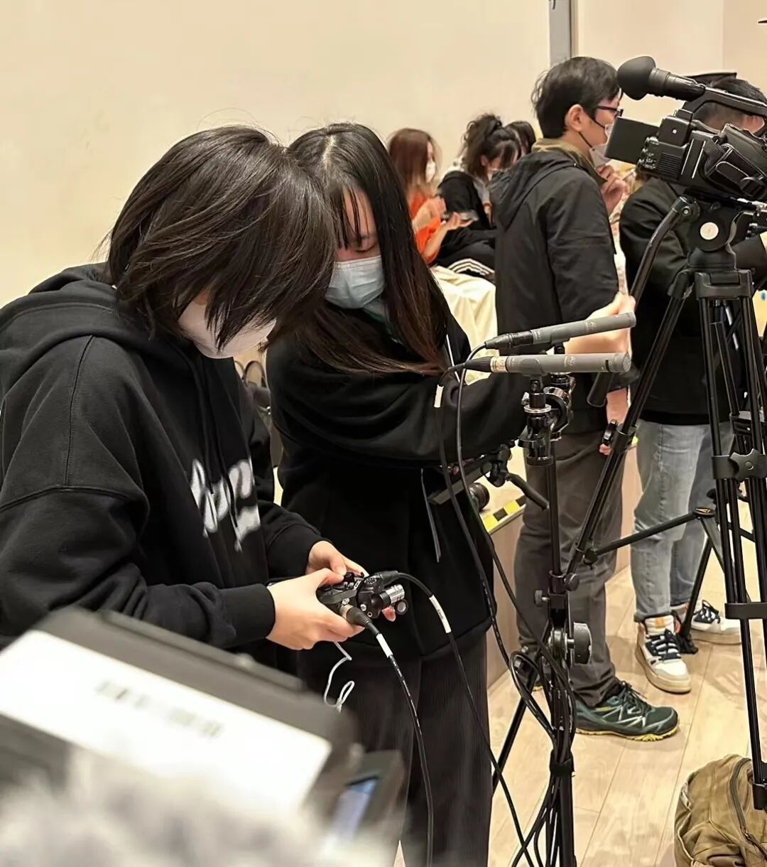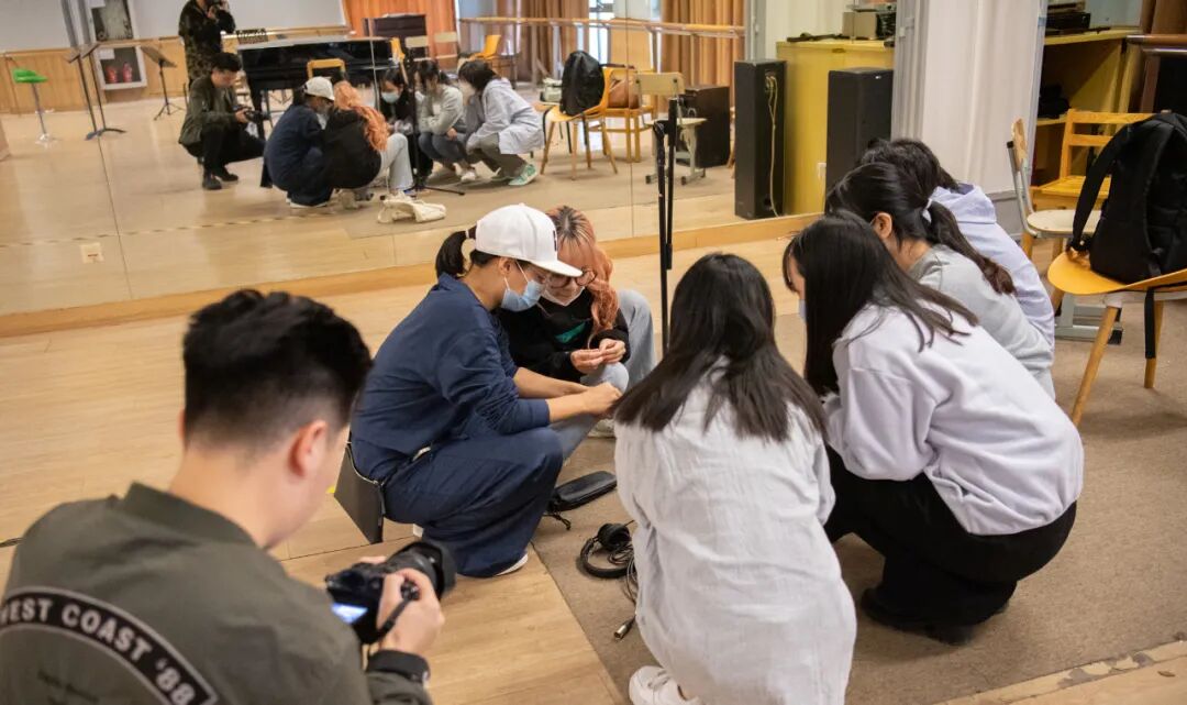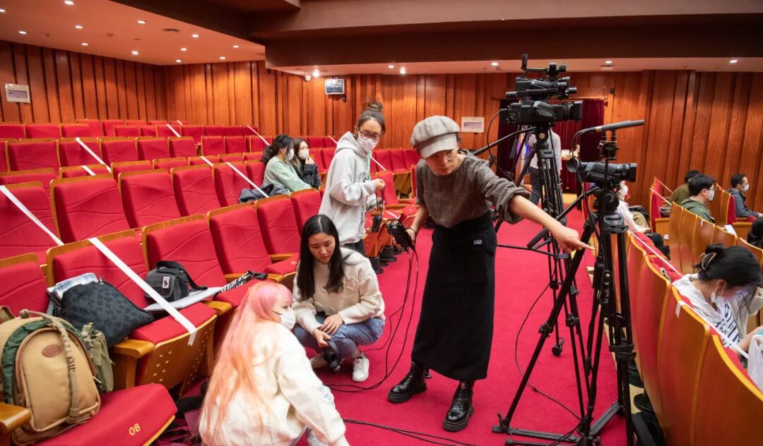 摄像组的首要任务是设置摄像的三个机位,分别为正中间的固定机位(索尼AX700),以及左右各一台的可移动机位。我们在一开始设置机位的位置时,便实践了30度规则(在设置机位时两个机位间相隔至少30度)进行设置,以防画面过于相似而造成跳切。在管弦排演厅有限的空间内,我们尽可能地将机位间相隔的角度拉开,进行多角度的拍摄,为后期的剪辑提供更为丰富的素材。在前面的课程中老师提前讲解了关于ORTF的录音模式,在这次的实操课上录音组就将课堂中的理论知识进行了实践。关于在架构两支话筒时相隔的距离、角度、指向等等,老师在实际操作过程中及时地指出了我们的不足并进行调整,巩固了我们的理论知识在实践中的运用。在摄影组的实践过程中,我们用了两个焦距不同的变焦镜头进行拍摄,分别捕捉了现场的特写和一些中、远景照片,在管弦排演厅中学习如何观察与捕捉各个角度的精彩瞬间。