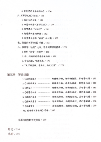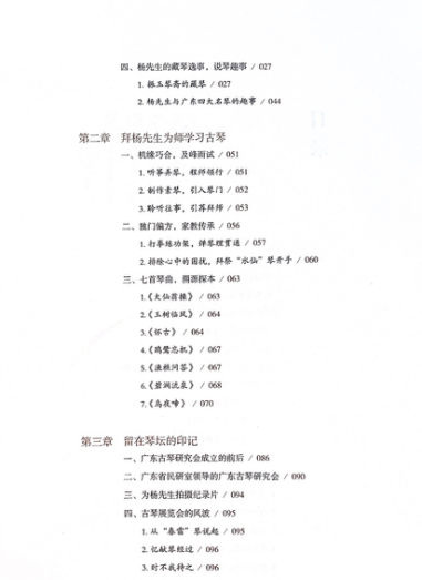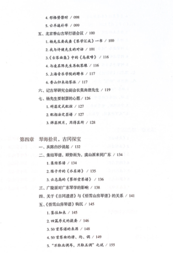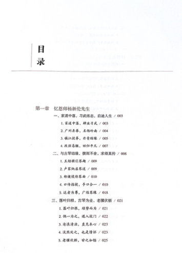 《古冈琴缘》由山东教育出版社出版,全书分为五个章节。在第一章中,作者首先回忆了学琴期间杨新伦先生的口述言谈,记叙了追随杨新伦的学艺始末、及杨先生的琴艺与志趣;第二章的内容为杨新伦先生授业法门的总结和作者所承曲目的溯源;第三章则以“回忆录”的形式,叙述了作者本人——作为古冈传人,在古琴事业中的经历与作为;在第四章中,作者将所承乐曲与其他各古琴脉络进行了横向对比与研究,从谱、器、律、调、史的角度,对古冈琴派曲目进行了细致分析;最后,在第五章中,以减字谱与简谱对照的形式,呈现了杨新伦所传授七首乐曲的全谱。全书史料丰富,图文并茂地展示了诸多珍贵的信件、节目单、会议资料和原本手抄谱、拳谱,更在朴实的叙说中,呈现了岭南古琴传承的历史面貌。